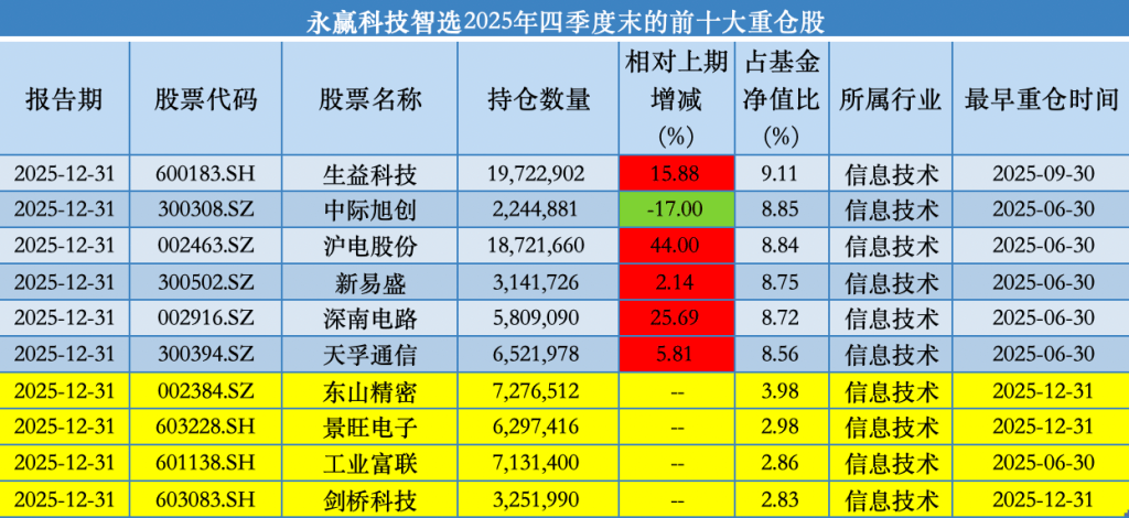 2026-01-22多宝体育,多宝体育官方网站,多宝体育APP下载具体来看,2025年四季度期间,永赢科技智选的持仓前十更迭了4只个股,前十大重仓股依次为:生益科技(600183.SH)、中际旭创(300308.SZ)、沪电股份(002463.SZ)、新易盛(300502.SZ)、深南电路(002916.SZ)、天孚通信(300394.SZ)、东山精密(002384.SZ)、景旺电子(603228.SH)、工业富联(601138.SH)、剑桥科技(603083.SH)。